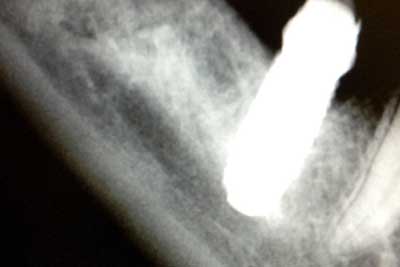 Intervención: Explantación de la fijación dental 4.6 con sumo cuidado para no intruir más el implante ni perjudicar más al nervio.